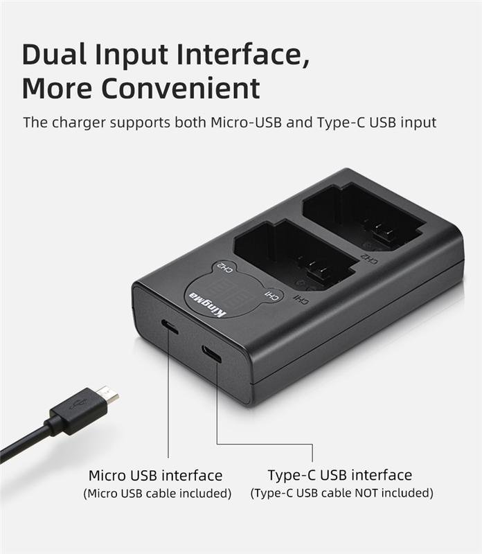 Двойное зарядное устройство для аккумуляторов типа Fujifilm NP-W235. Модель имеет подключение посредством Type-C (не в комплекте) и micro USB кабеля, что позволяет заряжать батареи от стандартного сетевого адаптера, автозарядки или даже Power Bank |