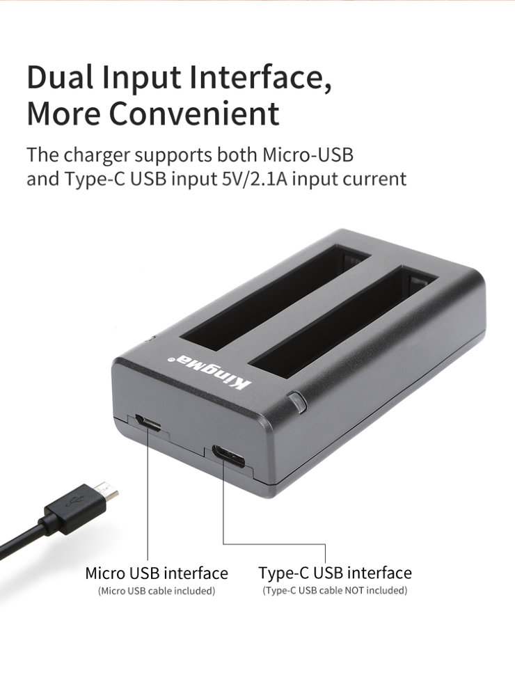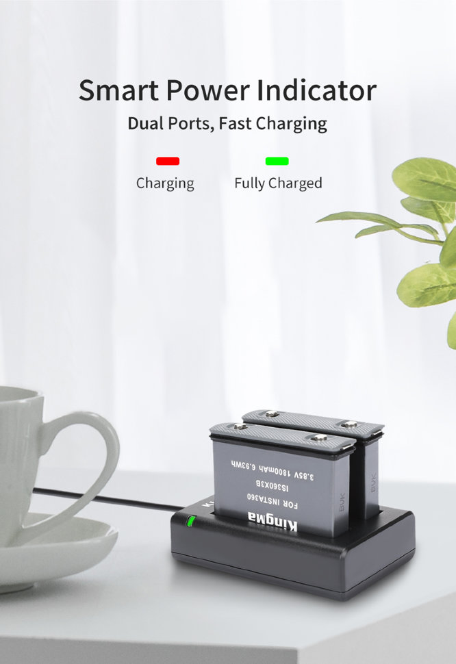 Компактное двойное зарядное устройство для аккумулятора Insta360 One X3. Предусмотрен светодиодный индикатор, который информирует о зарядке. Если он горит красным, значит идет зарядка, если зеленым, батарея полностью заряжена. Порт Micro USB и Type-C для подключения зарядного устройства к сети |