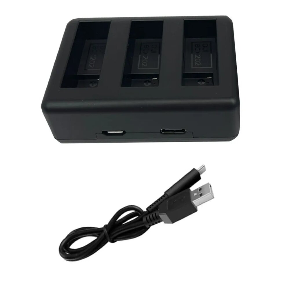 Зарядное устройство с тремя слотами для аккумуляторов BCX202 к экшн-камере DJI Osmo Action 3/4. Имеет компактные размеры и USB входы питания, что позволяет питать его от стандартного сетевого адаптера или power bank |
