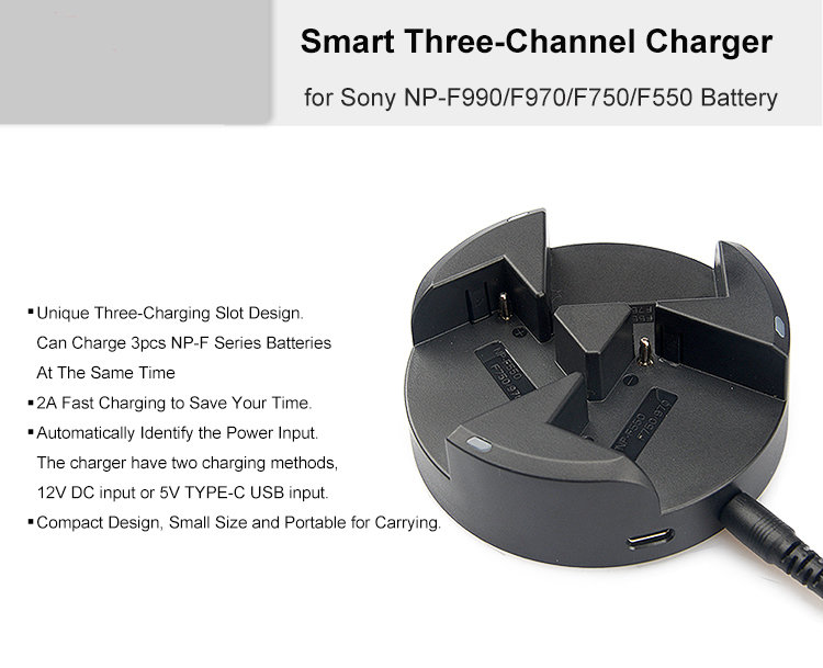 Компактное и лёгкое зарядное устройство для аккумуляторов применяемых в съёмочном оборудовании. Отличительной особенностью является необычная конструкция, позволяющая разместить одновременно целых три батареи для подзарядки. Подключить устройство можно как через сетевой адаптер, так и посредством кабеля Type-C (нет в комплекте) |