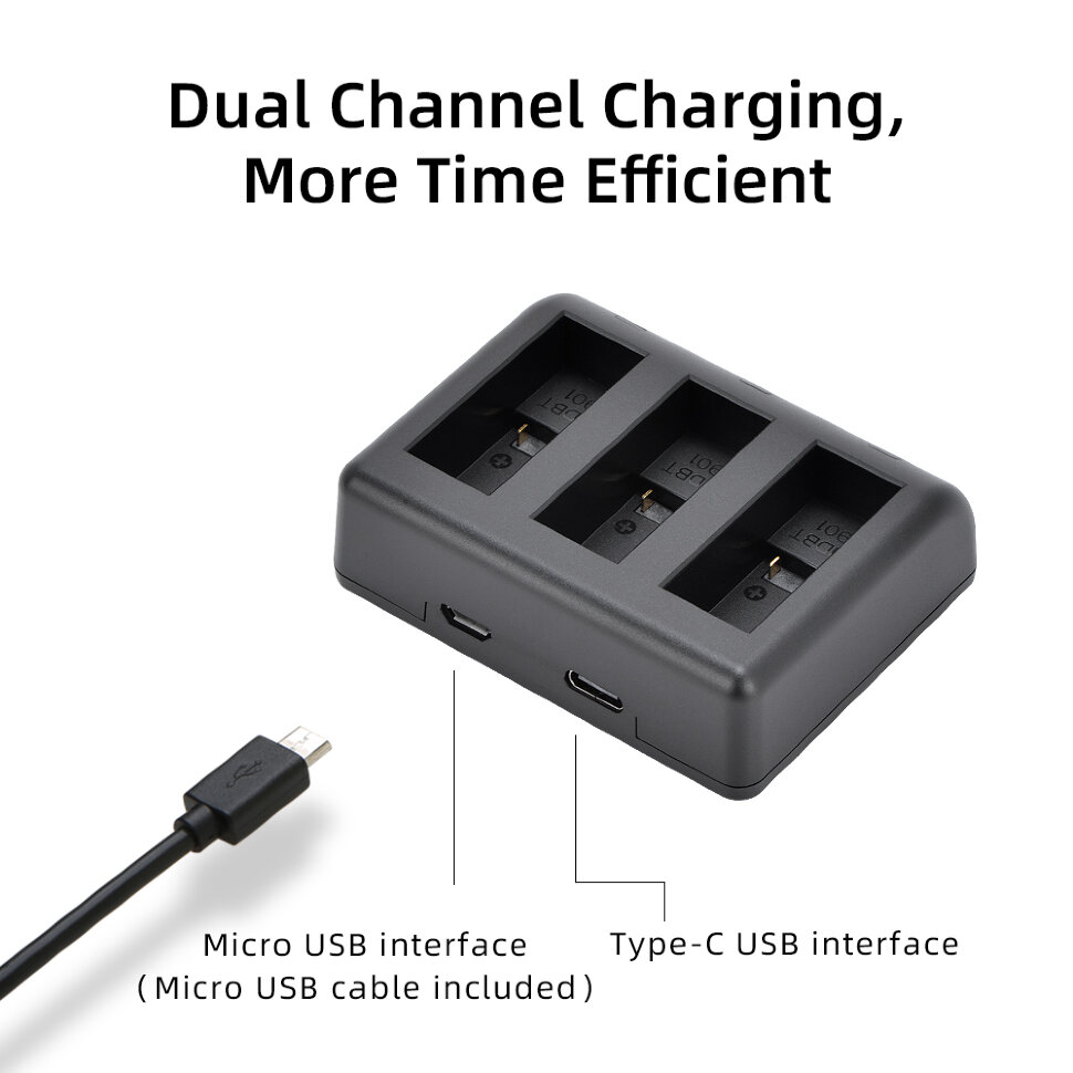 Зарядное устройство с тремя слотами для одновременной зарядки сразу нескольких аккумуляторов GoPro Hero 9 или 10 модели. Имеет индикатор статуса зарядки. Предусмотрены порт Type-C и micro USB |
