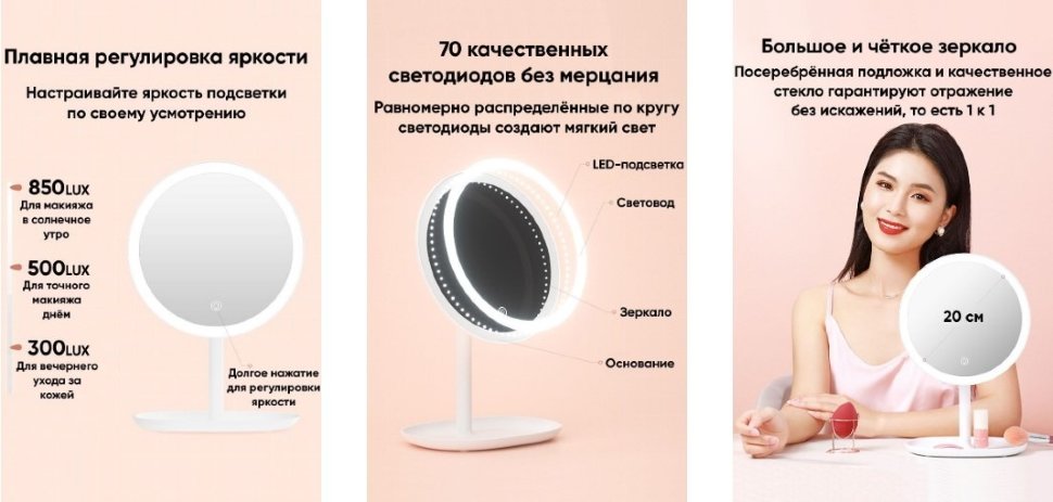 Косметическое зеркало NV543 оснащено подсветкой, что была разработана с особым вниманием к естественной цветопередачи. Светодиоды устройства имитируют естественный дневной свет. Предусмотрена регулировка оттенка света в трех вариантах, а также возможность выбора яркости |